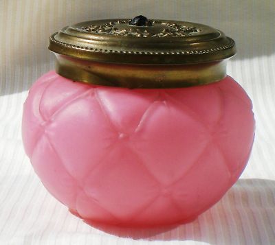 ANTIQUE PINK QUILTED SATIN GLASS POWDER JAR WITH JEWELED BRASS LID