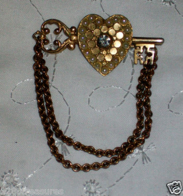 Title (ebay affiliate link): Vintage Key to My Heart Pin with 2 Chains Faux Pearls & Diamond