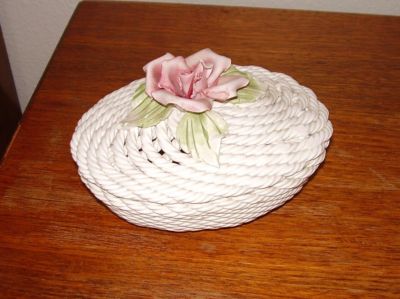 Title (ebay affiliate link): VINTAGE CAPODIMONTE LIDDED BASKET WEAVE TRINKET BOX PINK ROSE ITALY
