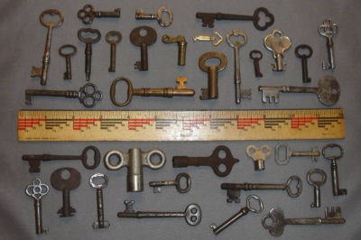 34 Antique & VTG Skeleton, RR?, Furniture, Lock, Barrel, Clock & Brass Keys Lot