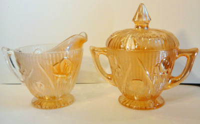 Title (ebay affiliate link): Iridescent Iris Sugar & Creamer Set Jeannette Depression Glass Yellow PRETTY!