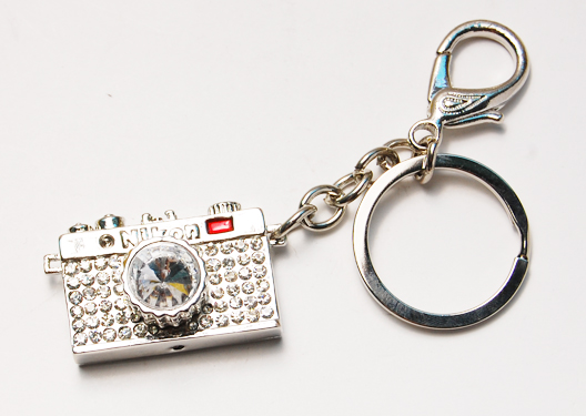 Title (ebay affiliate link): Silver Tone Clear Crystal Rhinestone Vintage Look Lens Camera Hook Clip Keychain