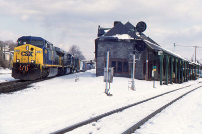 Original slide-CSX CW60AC #618 & Train/ Palmer, Mass.March 2001-Very NIce!!
