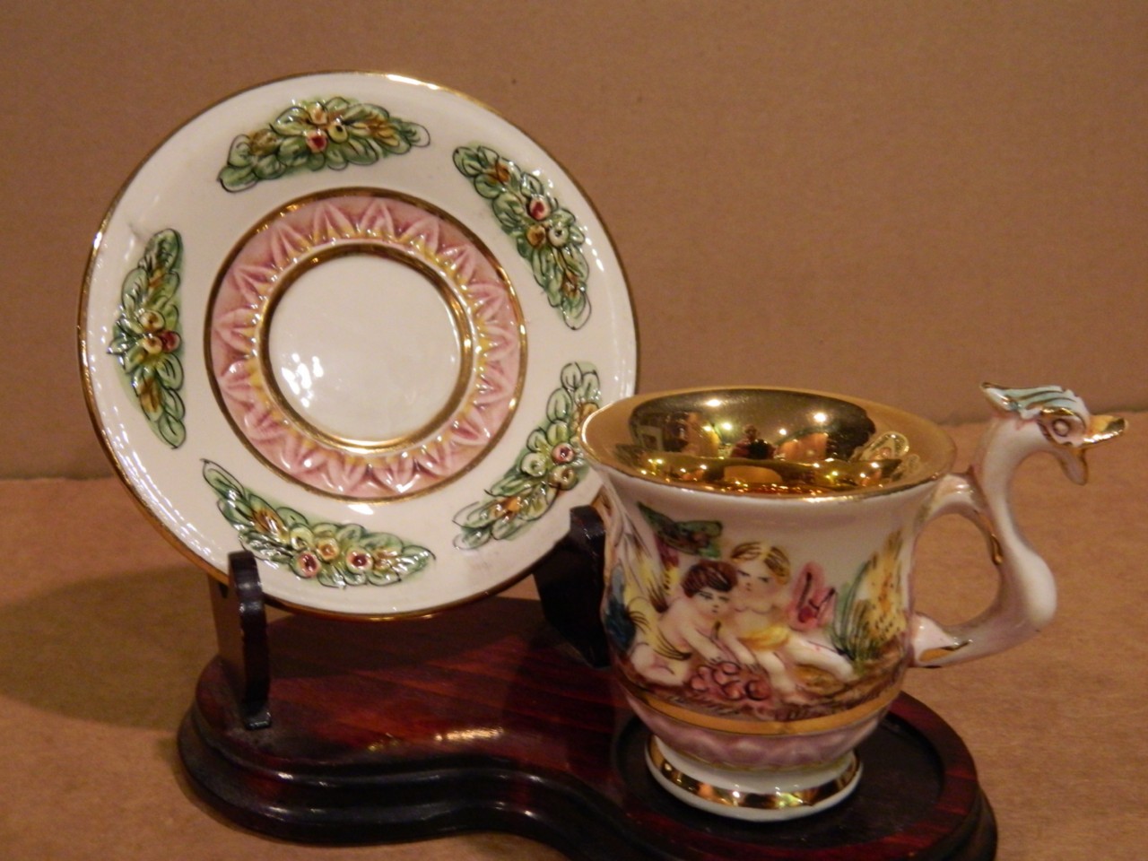 Title (ebay affiliate link): Capodimonte Italy Demitasse Cabinet Cup & Saucer Dragon Handle Raised Cherubs