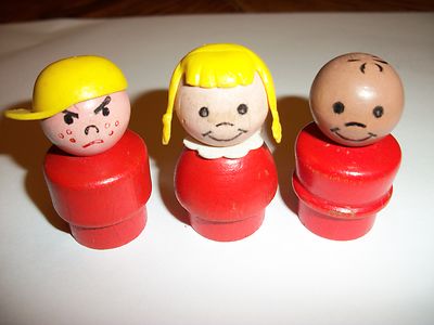 Vintage wooden Fisher Price Little people for old toy collectors,yellow hair,red