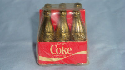 Title (ebay affiliate link): Vintage 6 Pack of 1960's Coca-Cola Miniature Metal Gold Bottles