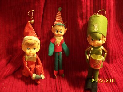 Title (ebay affiliate link): THREE VINTAGE CHRISTMAS ELVES - ONE KNEE HUGGER - ONE DRUMMER - ONE PIXIE
