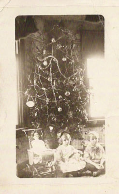 Title (ebay affiliate link): Real Photo Xmas PC. Sister, Brother, Tall Tree. Many Early Glass Ornaments