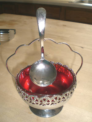 Title (ebay affiliate link): VINTAGE DEPRESSION RUBY GLASS BOWL IN STAND / SPOON