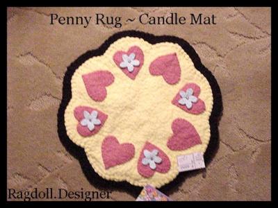 Title (ebay affiliate link): Handcrafted Penny Rug ~ Candle Mat Mauve Hearts