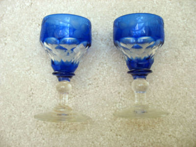 VINTAGE PAIR COBALT BLUE CORDIALS ENGRAVED GRAPES AND VINES