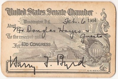 Title (ebay affiliate link): US SENATE CHAMBER PASS - 1954 - US SENATOR -- HARRY BYRD -- VIRGINIA