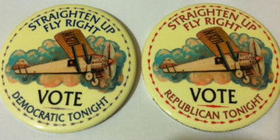 Title (ebay affiliate link): Pair of New Limited Edition 3 Inch Guardfrog Fly Right Rep. and Dem. Pinbacks