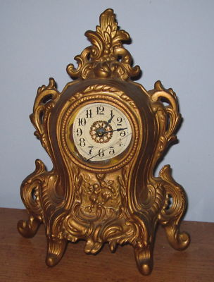 Title (ebay affiliate link): Vintage 1902-1906 Antique Metal Wind Up Mantel / Shelf Clock Made in USA (Works)