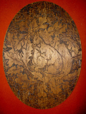 Antique Pyrographic/Flemish Art Oval Plaque Squirrels 1907