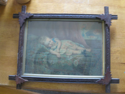 ANTIQUE CRISS CROSS PICTURE FRAME W/ OLD THE SLEEPING CHILD 1880