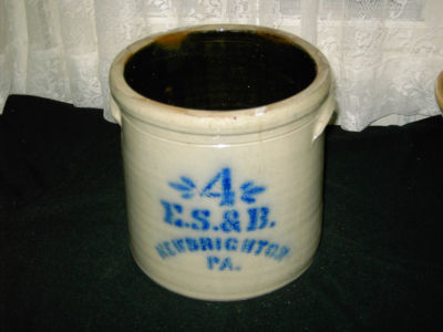 Title (ebay affiliate link): Early stoneware #4 crock E.S.&B. Newbrighton Pa printed in cobalt blue on front