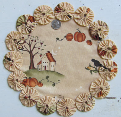 Primitive Salt Box House Crow Pumpkin Apple Quilt Fabric Yo Yo Candle Mat Doily