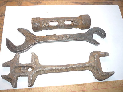 2 OLD ANTIQUE FARM WRENCH TOOLS & 1 SOCKET