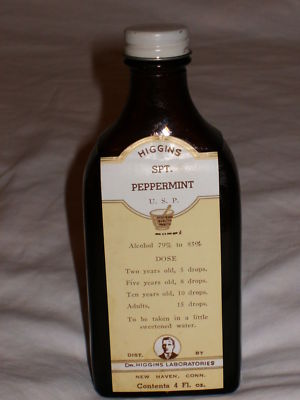Title (ebay affiliate link): 1940's Dr. Higgins Laboratories Spt. Peppermint Brown Glass Bottle Antique Mint