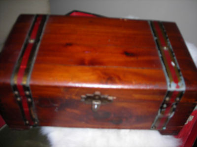 Title (ebay affiliate link): Old small wooden box/chest,rustic metal straps,dovetailed,unique,NR