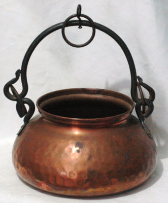 ANTIQUE HAMMERED COPPER KETTLE W/HAND FORGED HANGERS