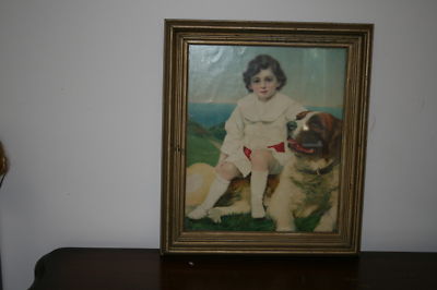 | Antique Wood Framed Print Victorian Boy with St. Bernard 18" by 14" |