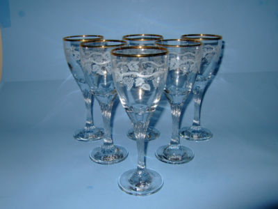 Title (ebay affiliate link): 6 VINTAGE WINE GOBLETS HAND DECORATED 24 KARAT GOLD WITH ETCHED GRAPE VINES