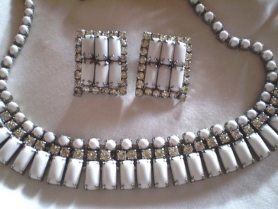 Title (ebay affiliate link): Vintage White Milk Glass & Rhinestone Demi UNSIGNED WEISS ?