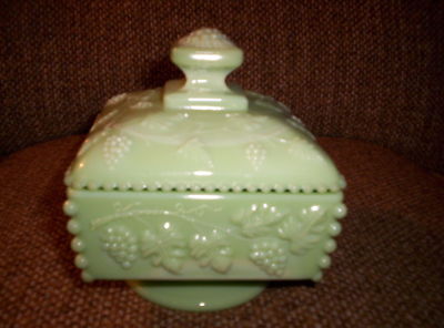 Title (ebay affiliate link): MINT GREEN MILK GLASS CANDY DISH WITH GRAPE DESIGN