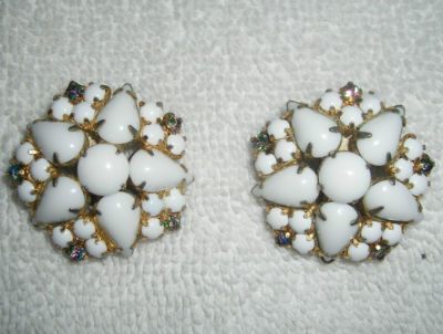 VINTAGE HOBE WHITE MILK GLASS RHINESTONE CLIP ON EARRINGS