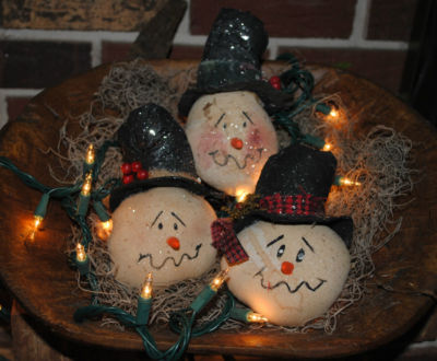 3 Primitive snowmen heads ,bowl fillers, ornies, holiday, Christmas, gift