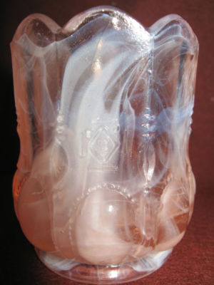 PINK AND WHITE MILK SLAG ART GLASS TOOTHPICK / MATCH HOLDER BEADED OVAL PATTERN