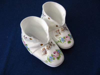 Title (ebay affiliate link): 50's Pair of Vintage Handpainted white milk glass Baby Shoes Floral Accents