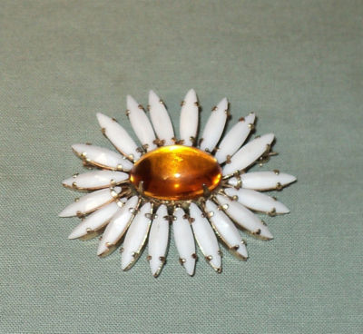 Title (ebay affiliate link): VINTAGE TOPAZ GLASS CAB MILK GLASS WHITE NAVETTE RHINESTONE FLOWER PIN BROOCH