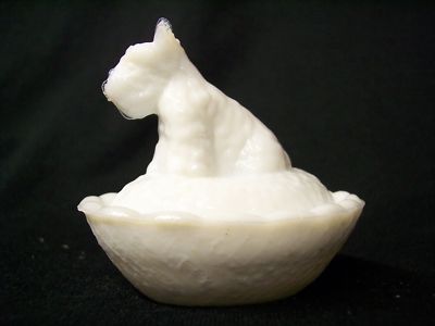 WHITE MILK GLASS SCOTTY ON BASKET OPEN SALT DIP DIPS