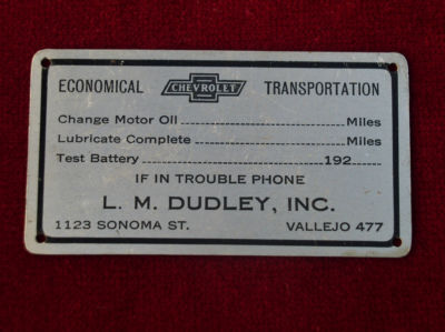 Chevrolet Vallejo Ca ID Metal Plate 1920s Phone # 477