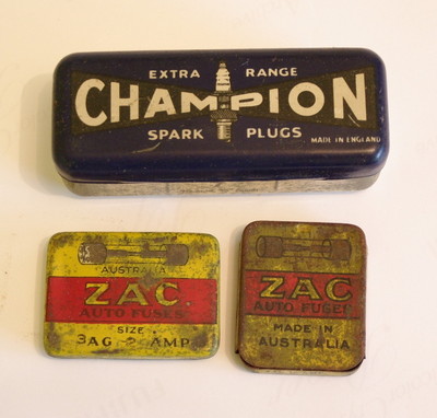 VINTAGE CHAMPION SPARK PLUG TINS & 'ZAC' AUTO FUSE TINS - GOOD CONDITION