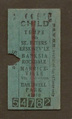 TEMPE - BARDWELL PARK 1945 SYDNEY CITYRAIL CHILD DARK GREEN ISSUE RAILWAY TICKET