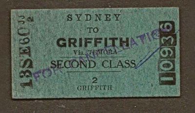SYDNEY - GRIFFITH 1945 SYDNEY CITYRAIL DARK GREEN ISSUE RAILWAY TICKET