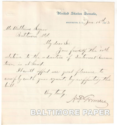 Title (ebay affiliate link): 1883 ARTHUR PUE GORMAN U.S. SENATOR SIGNED LETTER TAXES MARYLAND WILLIAM KEYSER