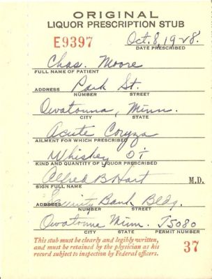 LIQUOR PRESCRIPTION STUB, OWATONNA, MINNESOTA, LOUIS SULLIVAN'S BANK BUILDING