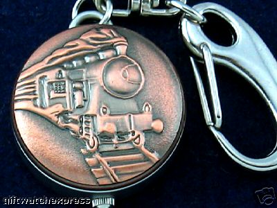 Title (ebay affiliate link): Steam Locomotive/Train Pendant Antique Style Quartz Keychain/Key Ring Watch Copp