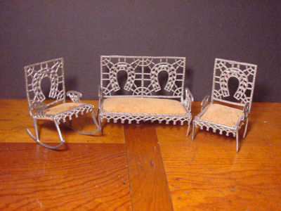 Title (ebay affiliate link): LOT Antique 1800s Metal DOLLHOUSE FURNITURE w Horse shoe Design Patented 1893