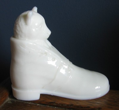 **** ANTIQUE MILK GLASS CAT IN SHOE CANDY CONTAINER NICE! ****