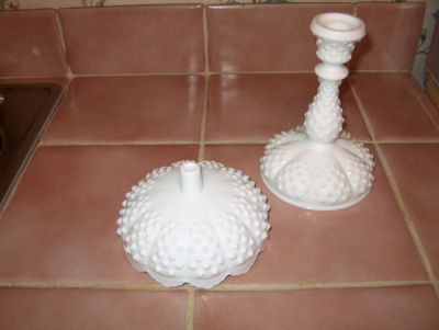 Title (ebay affiliate link): 2 Piece Fenton Hobnail White Milk Glass Candleholder Candlestick EUC Unmarked
