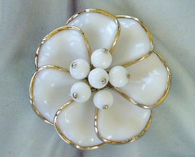 Title (ebay affiliate link): VINTAGE TRIFARI CAMELLIA FLOWER BROOCH PIN ~ MILK GLASS PETALS