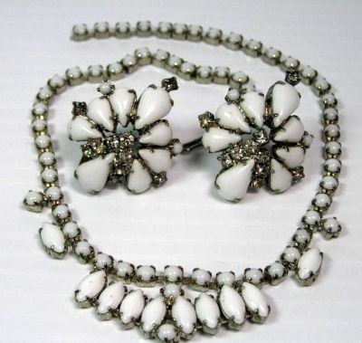 Title (ebay affiliate link): Vintage 15" WHITE MILK GLASS Navette & Chaton Choker Necklace & Earrings