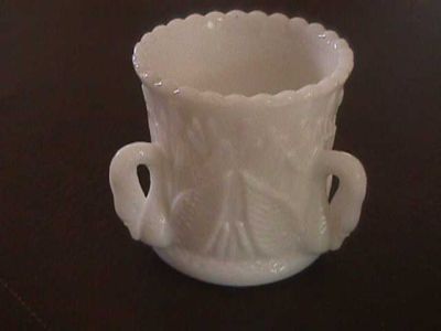Title (ebay affiliate link): WESTMORELAND TOOTHPICK HOLDER MILK GLASS WITH SWAN HANDLES/CATTAILS