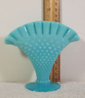 Title (ebay affiliate link): Vintage Blue Milk Glass Hobnail & Crimped Edge Fan Vase 4.25" tall